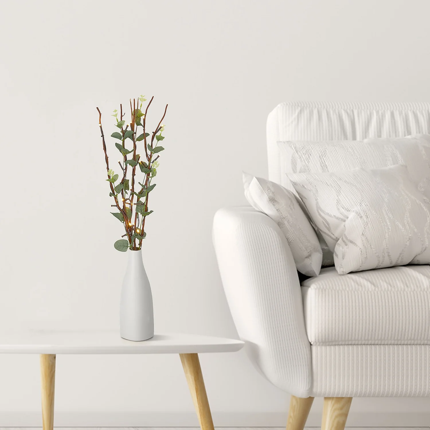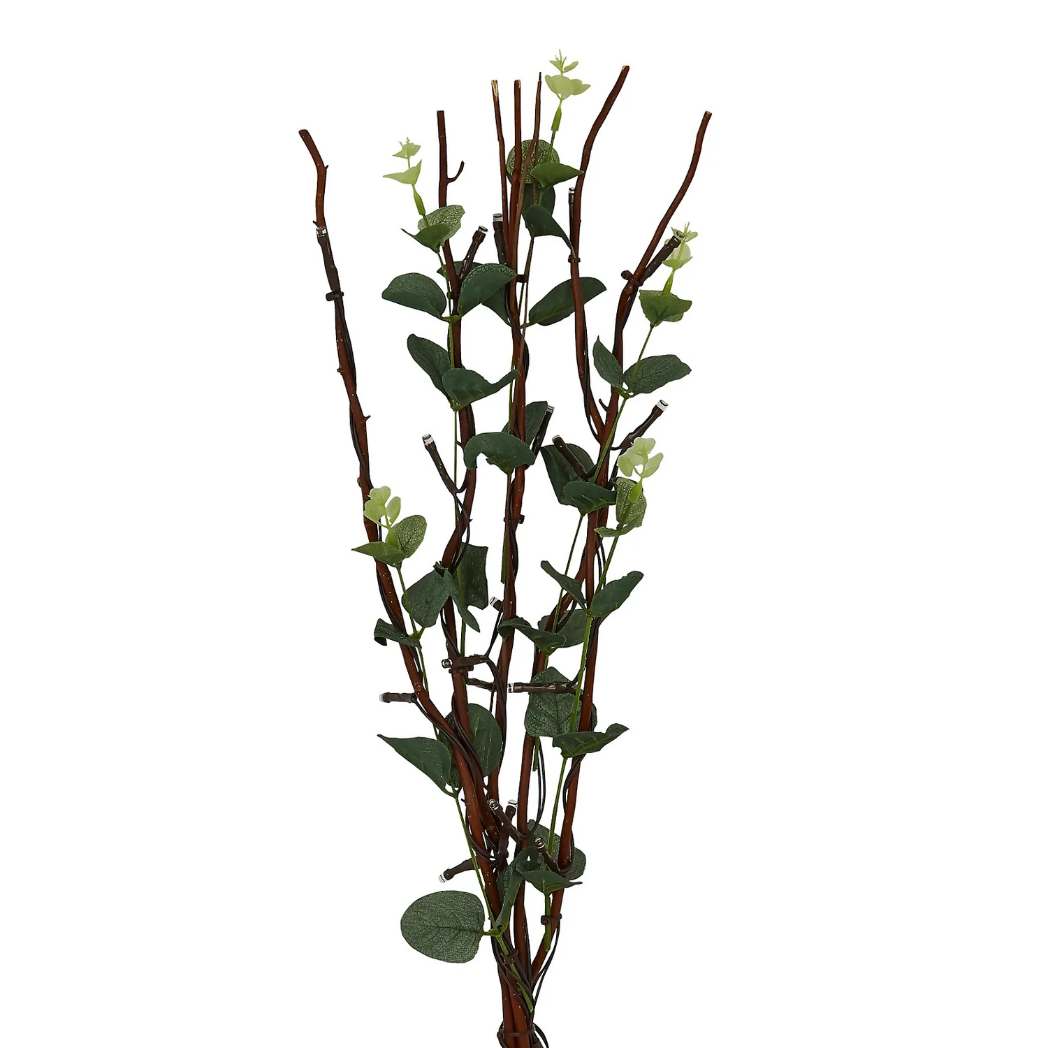 Decorative faux eucalyptus leaves and twigs are intertwined with fairy lights to give a simple, effective display that brightens up any living space.